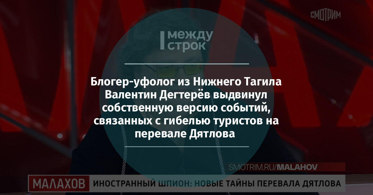 Известный тагильский уфолог и радиолюбитель из Нижнего Тагила Валентин Дегтерёв выдвинул собственную версию событий, связанных с гибелью девяти туристов под руководством Игоря Дятлова в окрестностях горы Холатчахль на севере Свердловской области в начале 1959 года. Своими выводами тагильчанин поделился в эфире программы «Малахов» (16+).
