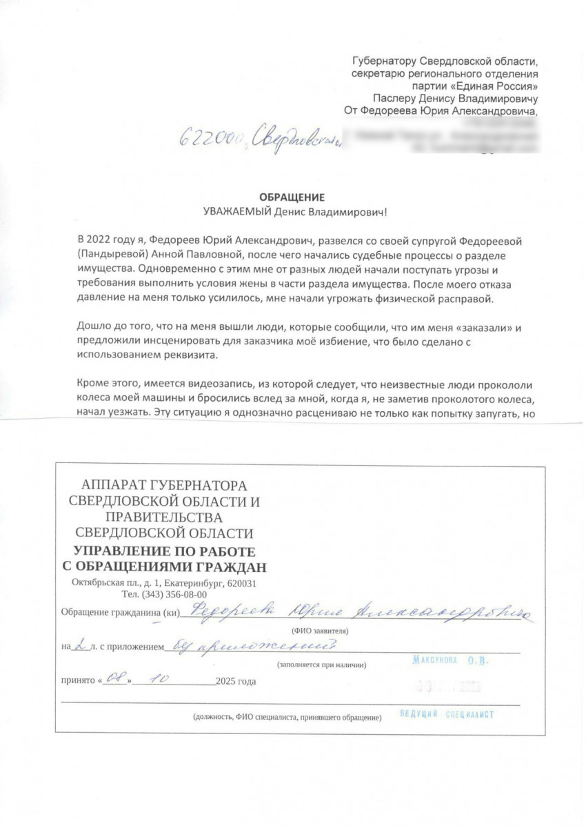 Бизнесмен отправил обращения генеральному прокурору РФ Александру Гуцану, председателю Следственного комитета РФ Александру Бастрыкину, полпреду президента в УрФО Артёму Жоге, губернатору Свердловской области Денису Паслеру, председателю Законодательного собрания Свердловской области (ЗакСО) Людмиле Бабушкиной и уполномоченному по правам человека в регионе Татьяне Мерзляковой.