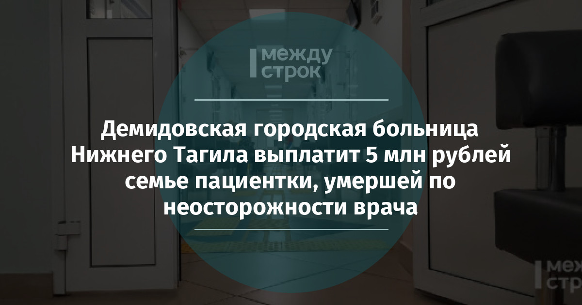 Ленинский районный суд Екатеринбурга обязал Демидовскую городскую больницу Нижнего Тагила выплатить 5 млн рублей супругу и детям пациентки, скончавшейся по неосторожности врачей.