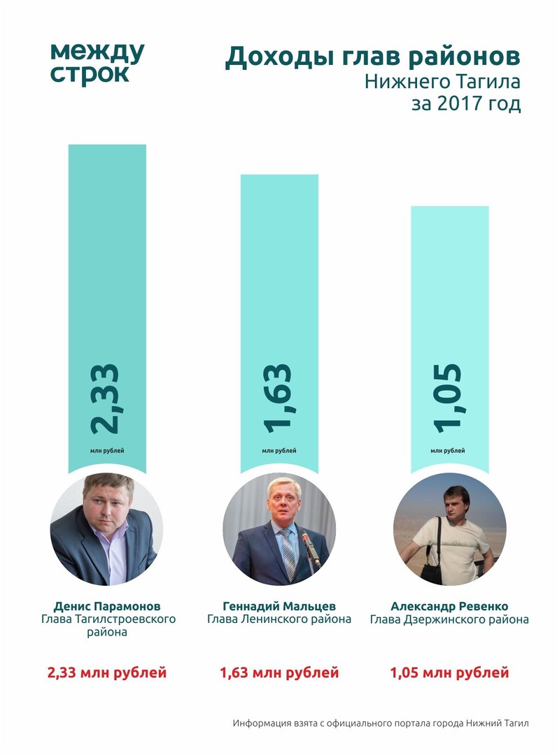 В 2017 году доходы главы Тагилстроевского района Дениса Парамонова увеличились в два раза — до 2,33 миллиона рублей, а заработок начальника управления архитектуры и градостроительства Константина Никкеля снизился с 1,46 миллиона рублей до 685,4 тысячи рублей. Сведения о доходах, расходах и имуществе заместителей главы города, глав районов, начальников и ведущих специалистов управлений и отделов опубликованы на официальном портале Нижнего Тагила.