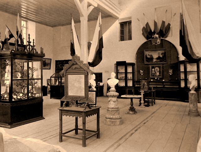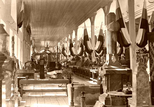 На переднем плане — экспозиция К. И. Трапезникова (фото 1887 г. / общ. достояние)
