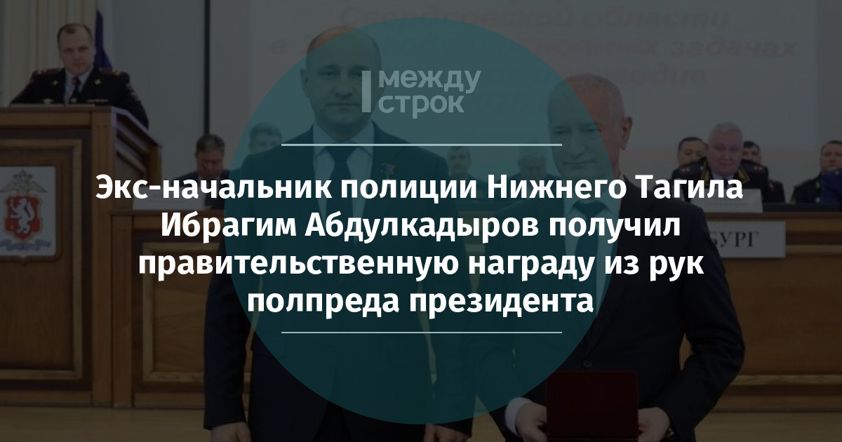 Полпред президента РФ в Уральском федеральном округе Артём Жога вручил бывшему начальнику МУ МВД «Нижнетагильское» полковнику Ибрагиму Абдулкадырову медаль ордена «За заслуги перед Отечеством» II степени. Награждение прошло сегодня во время расширенного заседания Коллегии ГУ МВД России по Свердловской области.