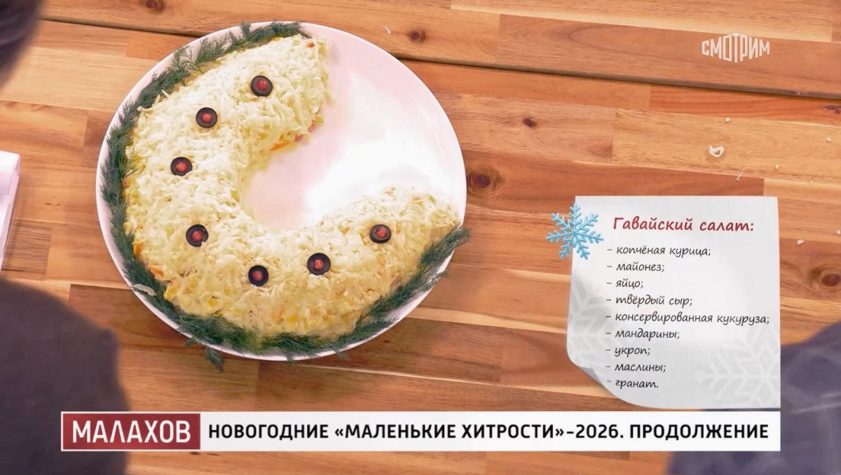 Фуд-блогер из Нижнего Тагила Никита Кравченко принял участие в праздничном выпуске телепрограммы «Малахов» (16+). В эфире участники делились новогодними лайфхаками, которые помогают сделать подготовку к праздничному вечеру проще, быстрее и экономнее. Всего вышло две части программы, и тагильчанин появился во второй, где представил зрителям рецепт гавайского салата с мандаринами.