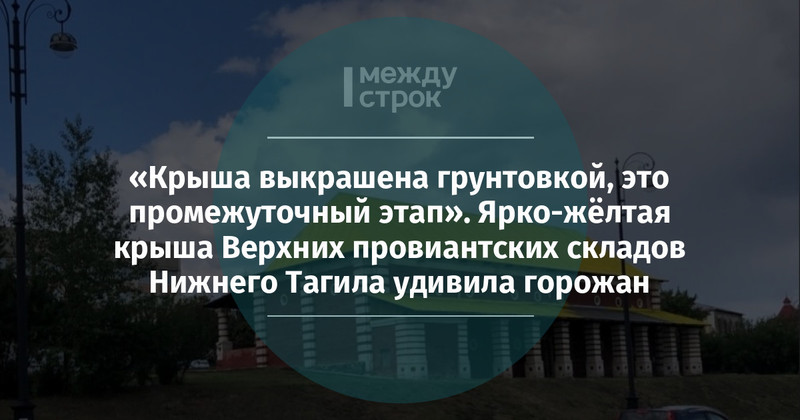 Ярко-жёлтая крыша Верхних провиантских складов Нижнего Тагила удивила и возмутила многих горожан, её бдительные жители заметили ещё в субботу, 24 июня. Выяснилось, что причиной возмущения стала грунтовка по металлу, которая позднее будет закрашена, о чём наблюдательные тагильчане, выражавшие своё недовольство, конечно же не знали. В здании располагается музей природы и охраны окружающей среды и сейчас рабочие приступили к ремонту кровли.