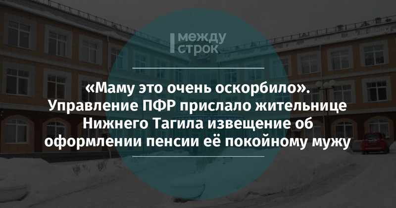 На прошлой неделе на почту тагильчанки Елены (все имена изменены. — Прим. ред.) пришло письмо из Пенсионного фонда России (ПФР), адресованное её покойному мужу. В середине января Алексей скоропостижно скончался на 61-м году жизни, но из-за пенсионной реформы не успел уйти на заслуженный отдых. Извещение о том, что в марте мужчине необходимо обратиться в ПФР для заблаговременного оформления страховой пенсии по старости, семья покойного получила на 40-й день после его смерти.