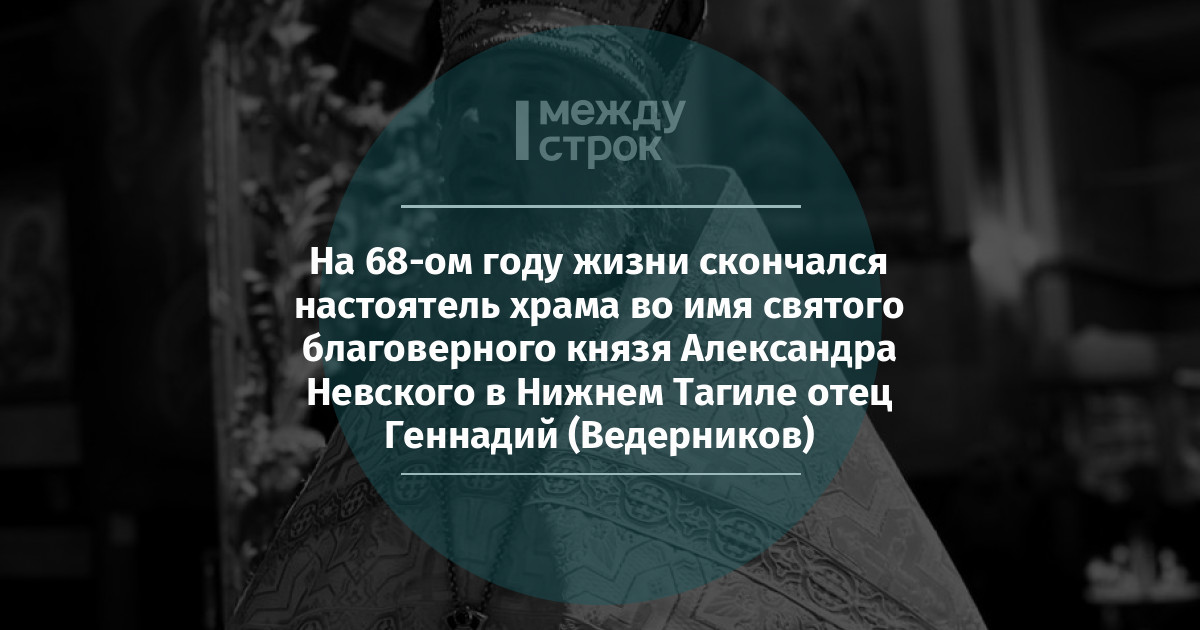 Сегодня, 1 октября, ночью на 68-ом году жизни скоропостижно скончался благочинный Центрального округа Нижнетагильской епархии, настоятель храма во имя святого благоверного князя Александра Невского митрофорный протоирей Геннадий Ведерников. Об этом сообщил в социальных сетях архиерей Русской православной церкви, митрополит Екатеринбургский и Верхотурский Евгений.