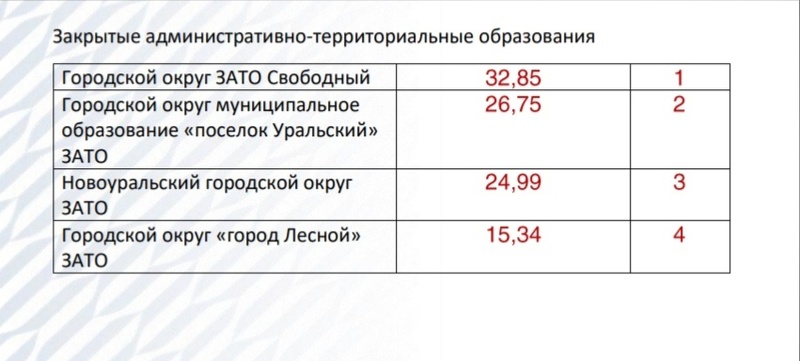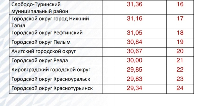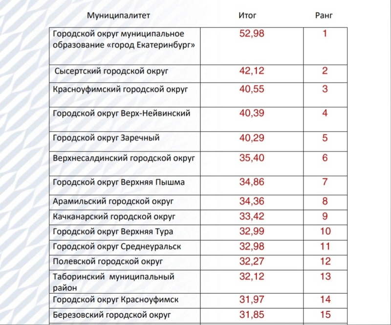 Рейтинг охватывает все городские округа и муниципальные районы Свердловской области. По мнению экспертов РАНХиГС, главным критерием их социально-экономической устойчивости стало наличие условий для поступательного развития экономики. Основой для рейтинга послужили 15 экономических и социальных индикаторов. Среди них — динамика численности населения, объём отгруженных товаров собственного производства, объём инвестиций, доходы бюджетов, средняя зарплата и ряд других показателей.По итогам исследования Екатеринбург занял лидирующую позицию и набрал 52,98 балла. Далее разместились четыре муниципалитета с индексом более 40 баллов — это Сысертский городской округ, занявший второе место в рейтинге (42,12 балла), Красноуфимский городской округ (40,55) , Верх-Нейвинский (40,39) и Заречный (40,29). Нижний Тагил разместился на 17-м месте, набрав 31,16 балла. Наихудшие показатели у Талицы, Первоуральска и Махнёво.