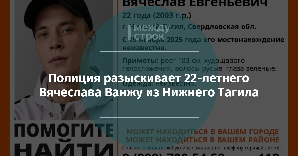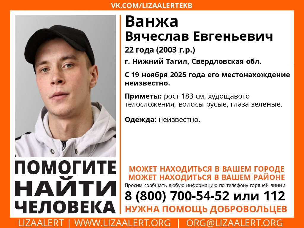 Сотрудники полиции и волонтёры разыскивают 22-летнего Вячеслава Ванжу из Нижнего Тагила. По информации родственников, парень уехал из города, предположительно в Екатеринбург, 19 ноября, после чего перестал выходить на связь.