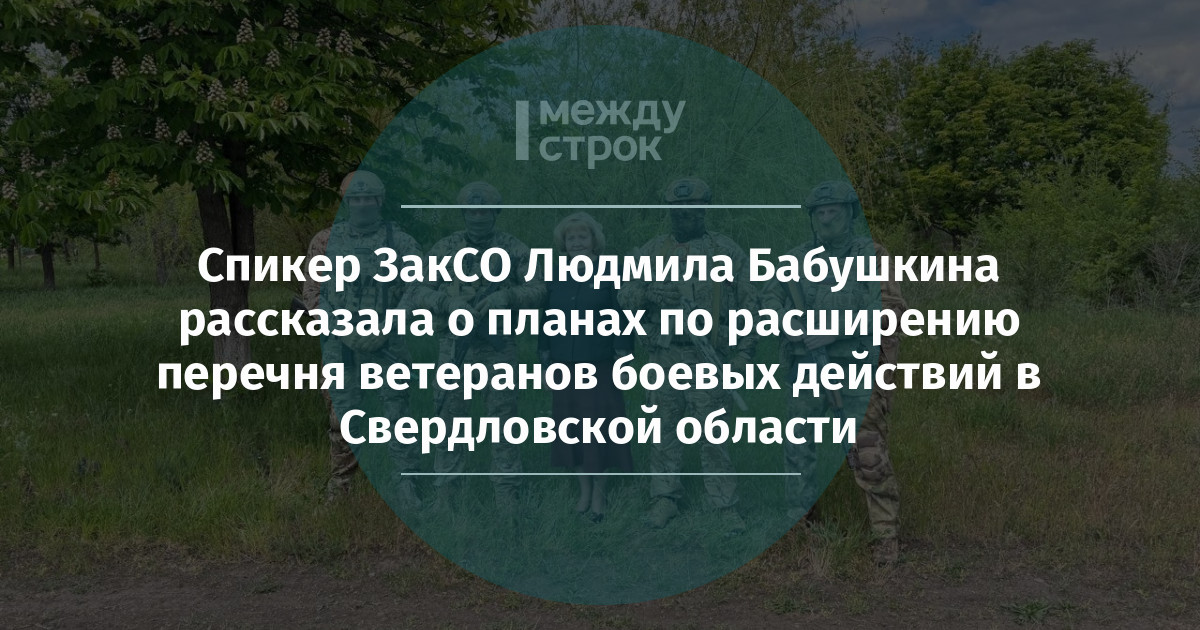 Председатель Законодательного собрания Свердловской области (ЗакСО) Людмила Бабушкина рассказала о планах расширить перечень ветеранов боевых действий в Свердловской области. Сейчас в региональном парламенте идёт работа над соответствующим законопроектом.