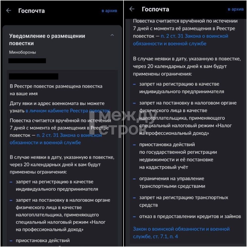 На днях сотруднику одного из крупных тагильских предприятий в сервисе «Госуслуги» пришло уведомление о получении повестки из военкомата. В сообщении говорится, что мужчине необходимо явиться в военкомат на улице Бажова в определённый день к конкретному часу. Также в уведомлении указано, что в случае неявки к адресату будут применены различные санкции: ограничение на управление транспортным средством, запрет на регистрацию ТС, отказ в предоставлении займов и кредитов и т.д.