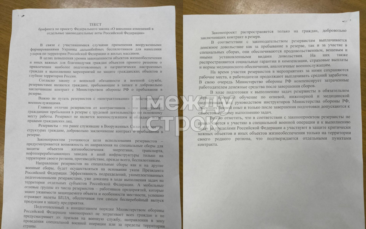 Также мужчине показали бумаги с текстом, который ссылается на Указ Владимира Путина от 4 ноября 2025 года, предусматривающий возможность направления граждан, заключивших контракт о пребывании в резерве ВС РФ, на сборы для защиты критически важных объектов.