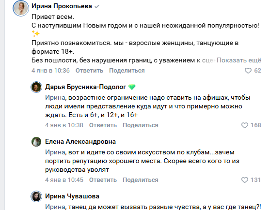 «Мы — взрослые женщины, танцующие в формате 18+. Без пошлости, без нарушения границ, с уважением к сцене и зрителю. Танец может вызывать разные чувства — от восхищения до дискомфорта. И это нормально: мы все воспринимаем увиденное через свой опыт, ценности и чувствительность. Да, смелые, искренние и задорные — и немного любим, когда народ активно обсуждает. Каждая взрослая женщина может себе это позволить… просто кто-то делает это тише, а кто-то — танцуя», — считает Ирина.