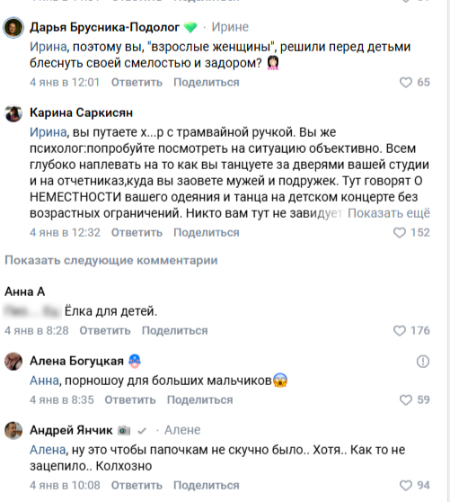 «Пришли с детьми на новогодние шоу «Кино ёлка». Были очень удивлены танцем этих женщин! Хотелось встать и уйти, особенно детям», — пишет подписчица паблика «Чёрный список Тагила».