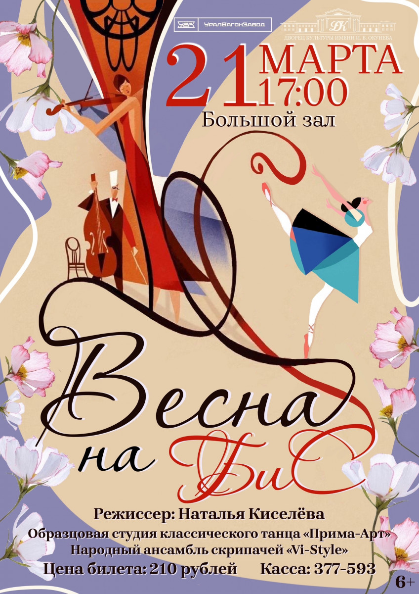 Весенний классический концерт к празднованию 90-летия «Уралвагонзавода». В программе: народный ансамбль скрипачей Vi-style, образцовая студия классического танца «Прима-арт». Гости концерта: артисты детской музыкальной школы № 1 им. Н. А. Римского-Корсакова и вокальный ансамбль Bellissimo. Цена билета: 210 рублей.