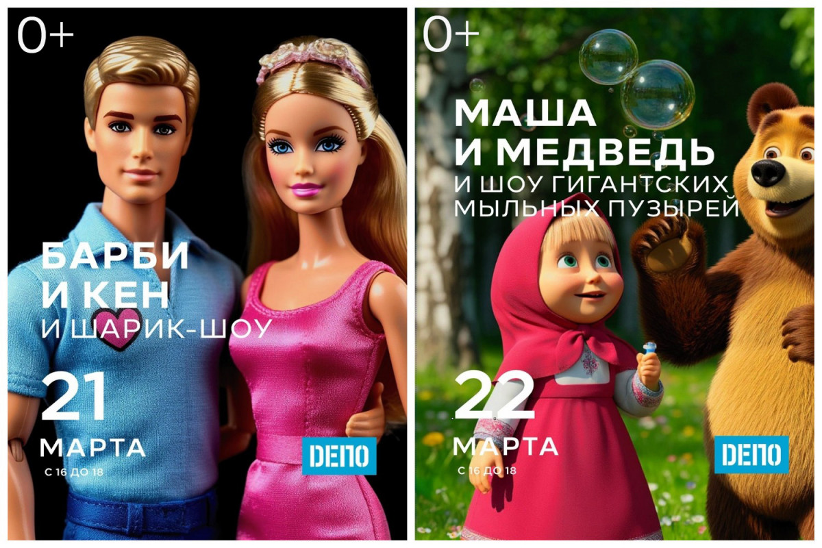 Организаторы приглашают на бесплатные игры с аниматором. 21 марта маленьких гостей ждёт встреча с Барби и Кеном и шарик шоу, а 22 марта — Маша и Медведь и шоу гигантских мыльных пузырей.