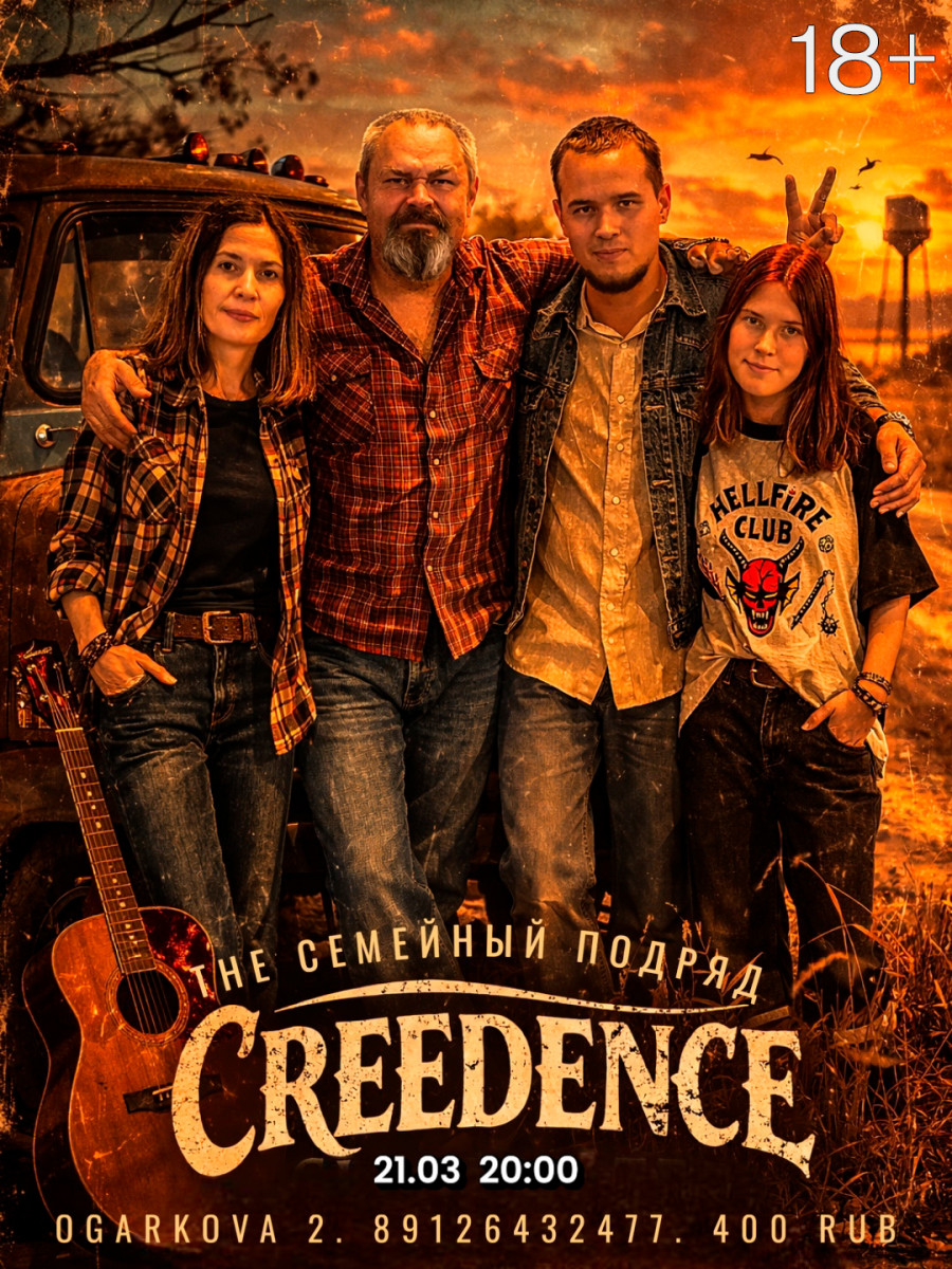 Рок-группа, состоящая из членов одной семьи: мама, папа, дочь, сын. Участники исполняют классический рок 60-70-х годов. Цена билета: 400 рублей.