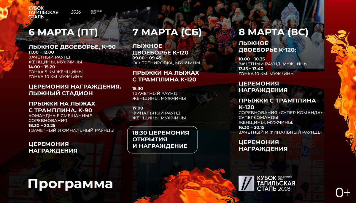 В Нижнем Тагиле на базе Спортивной школы олимпийского резерва «Аист» пройдёт весенний этап Кубка «Тагильская сталь». Лучшие российские прыгуны с трамплина и лыжники-двоеборцы, а также спортсмены из Беларуси и Казахстана выйдут на старт, чтобы показать максимум своих возможностей. Зрителей ждёт захватывающая борьба в финале зимнего сезона. 7 марта организаторы подготовили насыщенную программу для гостей. В этот день будет работать зона активностей для зрителей: мастер-классы для детей, изготовление брендированных термокружек, создание букетов из сухоцветов, розыгрыши и интерактивы. Хэдлайнером зрительской программы станет кавер-группа «Годжи», которая создаст атмосферу настоящего спортивного праздника. С подробным расписанием можно ознакомиться на официальном сайте соревнований. Вход свободный.