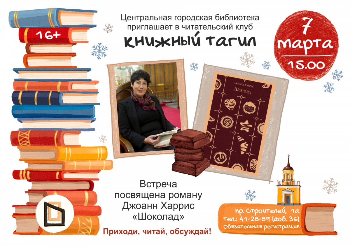 Читательский клуб «Книжный Тагил» приглашает на тёплую и душевную встречу. В этот раз участники соберутся, чтобы вместе открыть для себя удивительный мир романа Джоанн Харрис «Шоколад» (16+) — книги, где каждая страница дышит теплом, ароматом какао и духом свободы. Необходима предварительная регистрация. Вход свободный.