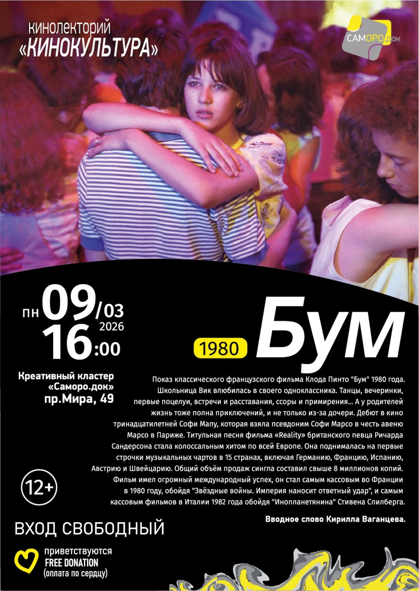 Показ классического французского фильма Клода Пиното «Бум» (1980, 12+). По сюжету, школьница Вик влюбилась в своего одноклассника. Танцы, вечеринки, первые поцелуи, встречи и расставания, ссоры и примирения... А у родителей жизнь тоже полна приключений, и не только из-за дочери.