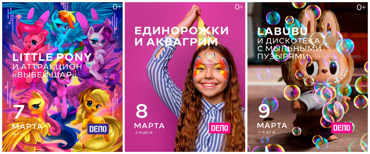 Организаторы приглашают на бесплатные игры с аниматором. 7 марта маленьких гостей ждёт встреча с героями мультфильма My Little Pony и аттракцион «Выбей шар». 8 марта — встреча с единорожками и аквагрим, а 9 марта — Лабубу и дискотека с мыльными пузырями.