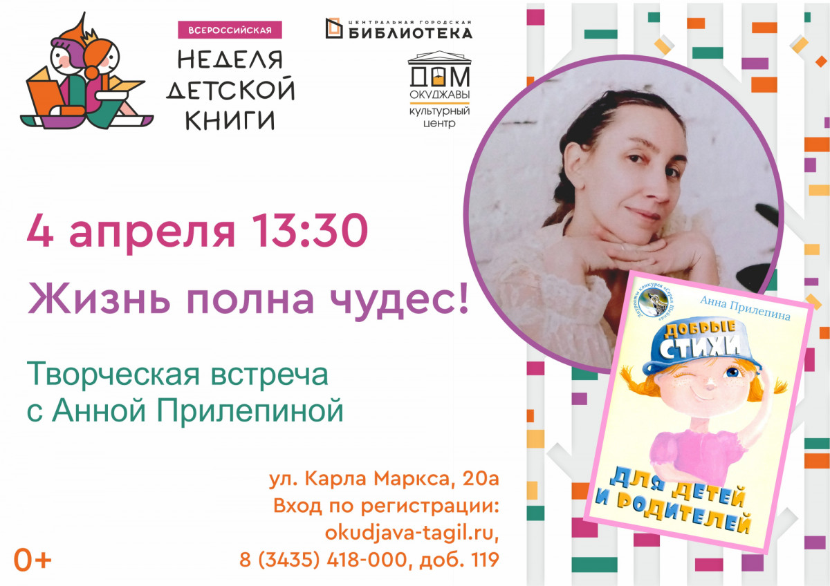 В культурном центре в рамках Недели детской книги состоится творческая встреча с писательницей Анной Прилепиной. Она — уроженка Нижнего Тагила, автор детских стихов и прозы, мюзиклов, а также песен для детей и взрослых. Её творчество отличается яркостью, искренностью и вниманием к внутреннему миру ребёнка. Вход свободный, необходима регистрация.