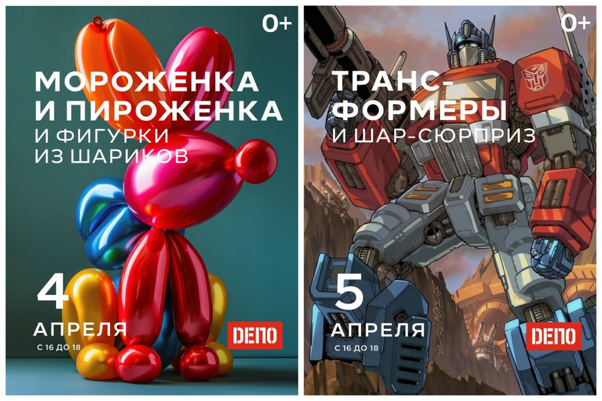 Организаторы приглашают на бесплатные игры с аниматором. 4 апреля маленьких гостей ждёт встреча с Мороженкой и Пироженкой и фигурки из шариков, а 5 апреля — Трансформеры и шар-сюрприз.
