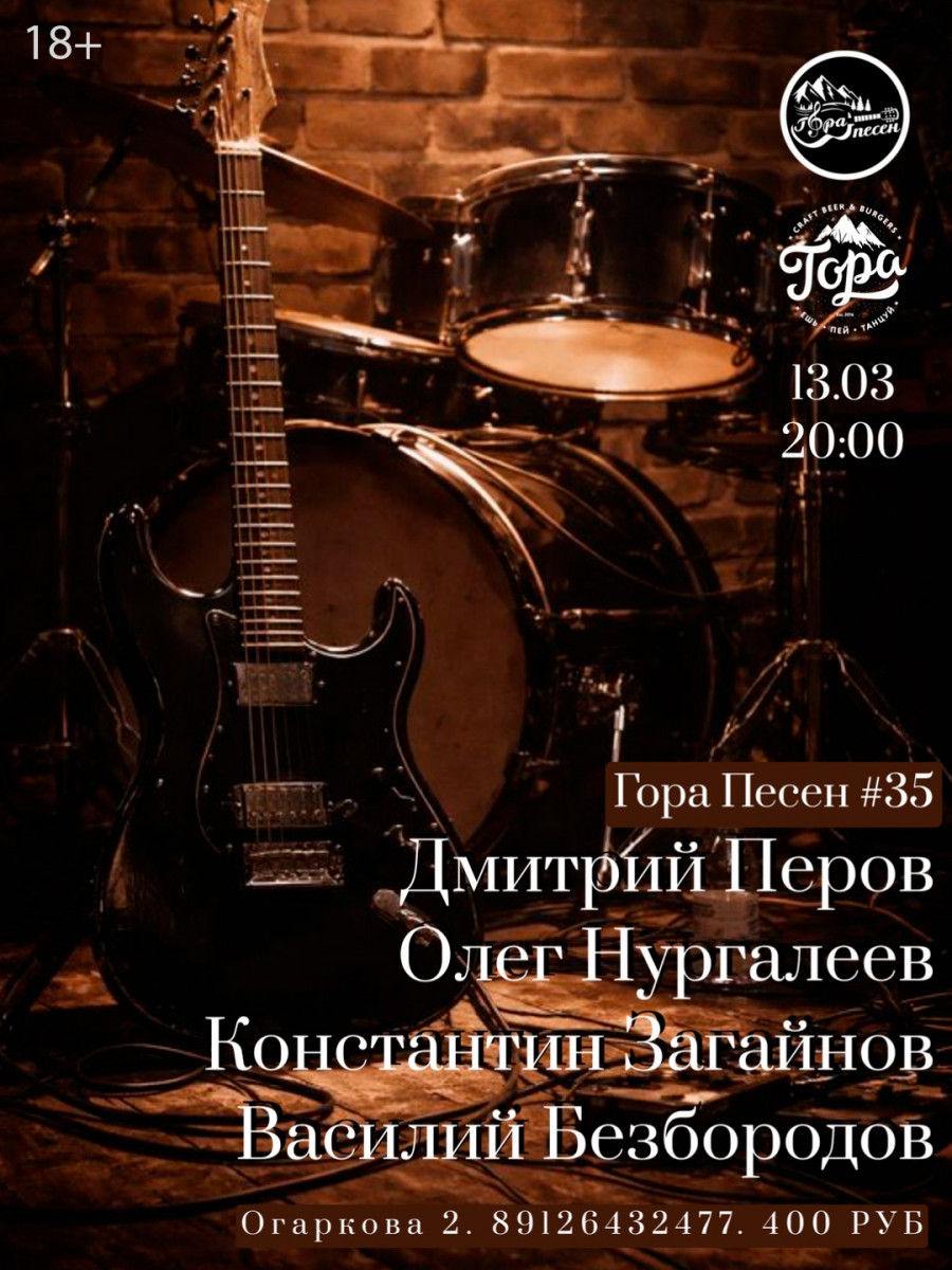 «Гора Песен» с каждым новым эпизодом все мощнее и лучше. К певцу Дмитрию Перову присоединится Константин Загайнов, Олег Нургалеев и хедлайнер — Василий Безбородов. Вход — 400 рублей. Бронь столиков по номеру +7(912)643-24-77.