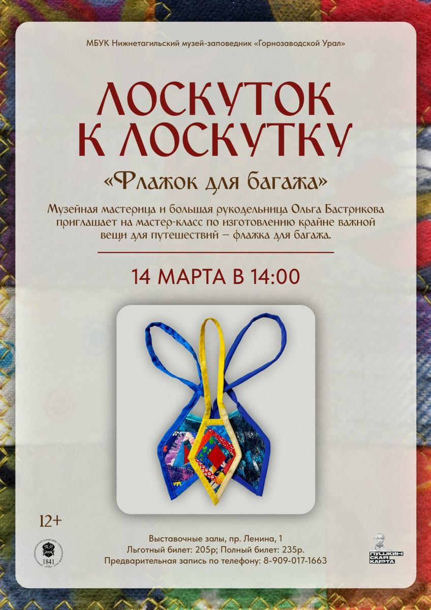 Мастерица Ольга Бастрикова раскроет секреты необычных техник лоскутного шитья — «пицца» и «крэйзи». Вы не только придумаете свои уникальные узоры, но и сошьёте яркий флажок-метку, который сделает ваш багаж неповторимым. В музее просят заранее сообщать об участии в мероприятии, отправив сообщение в группу https://vk.com/artmnt или позвонив по номеру 8 (3435) 25-26-47.