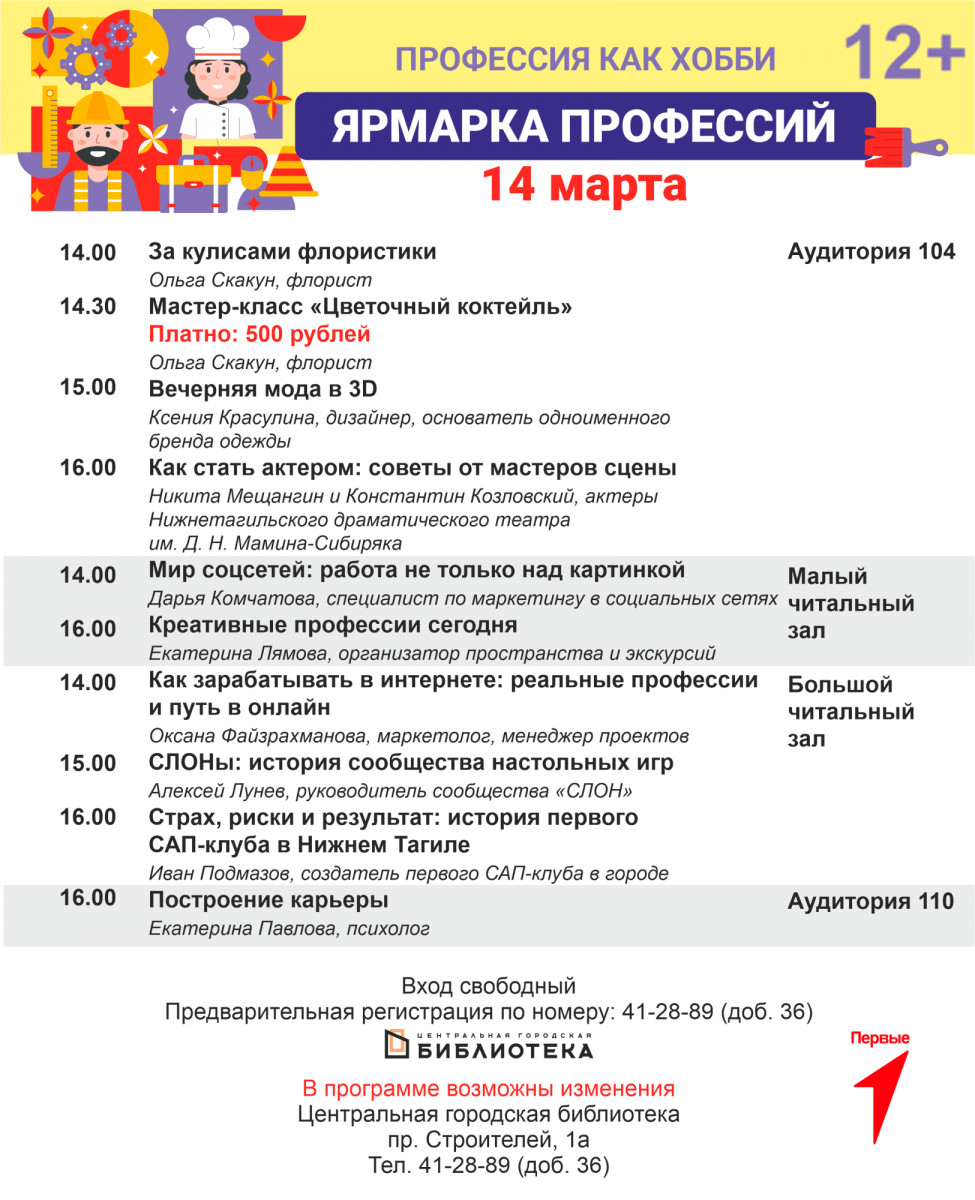 Центральная городская библиотека приглашает всех в мир современных профессий. Гости смогут познакомиться с разными специальностями и пообщаться с настоящими мастерами своего дела. Приходите на ярмарку профессий, чтобы узнать о разных специальностях из первых рук, задать вопросы профессионалам и, возможно, найти свое призвание. Предварительная регистрация по номеру телефона: 41-28-89 (доб. 36).