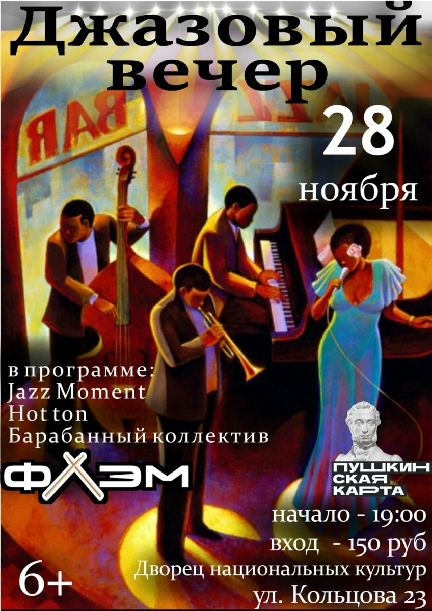 Коллективы Jazz Moment, Hot Ton и барабанный коллектив «Флэм» представят программу, наполненную мелодиями и ритмами, которые заставят ваше сердце биться сильнее. Вас ждут импровизации, душевные композиции и, конечно же, неповторимая энергетика живого исполнения. Время начала концерта — 19:00.