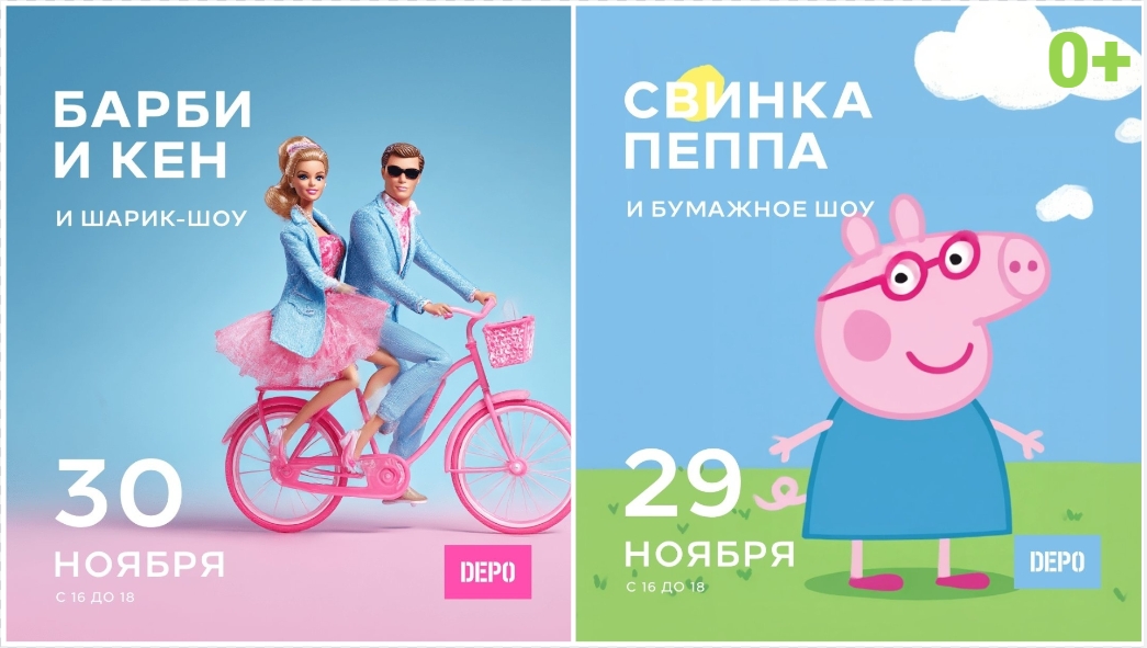 Организаторы приглашают на бесплатные игры с аниматором. 29 ноября маленьких гостей ждёт встреча со Свинкой Пеппой и бумажное шоу, 30 ноября — Барби и Кен и шарик-шоу.