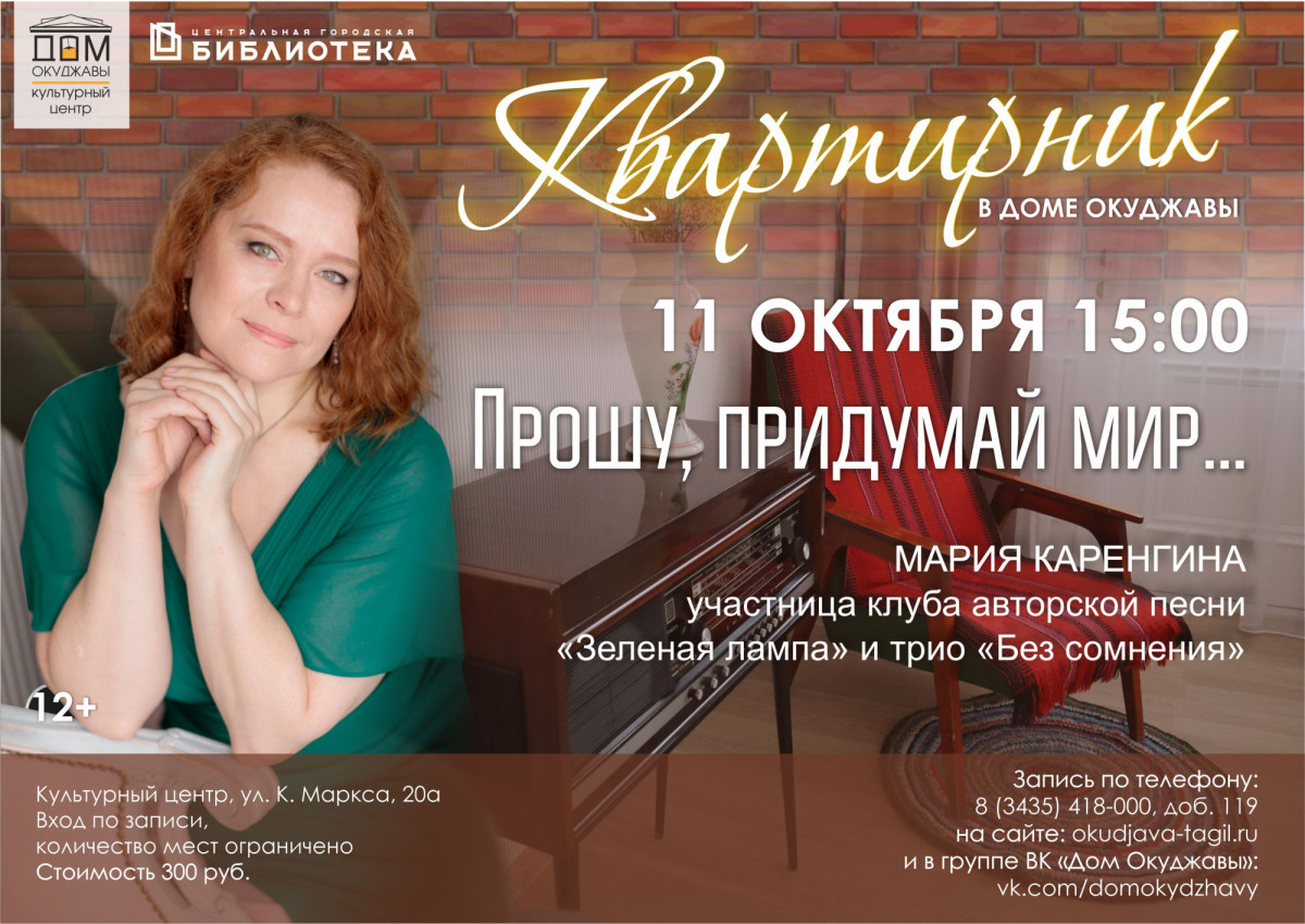 Мария Каренгина – участница клуба авторской песни «Зелёная лампа» и исполнительница в составе трио «Без сомнения». В программе «Прошу, придумай мир…» будут исполнены малоизвестные композиции как классиков авторской песни, так и современных авторов. Прозвучит философская лирика Юрия Визбора, Юрия Лопеса, Дмитрия Бикчентаева, Ксении Полтевой и многих других.