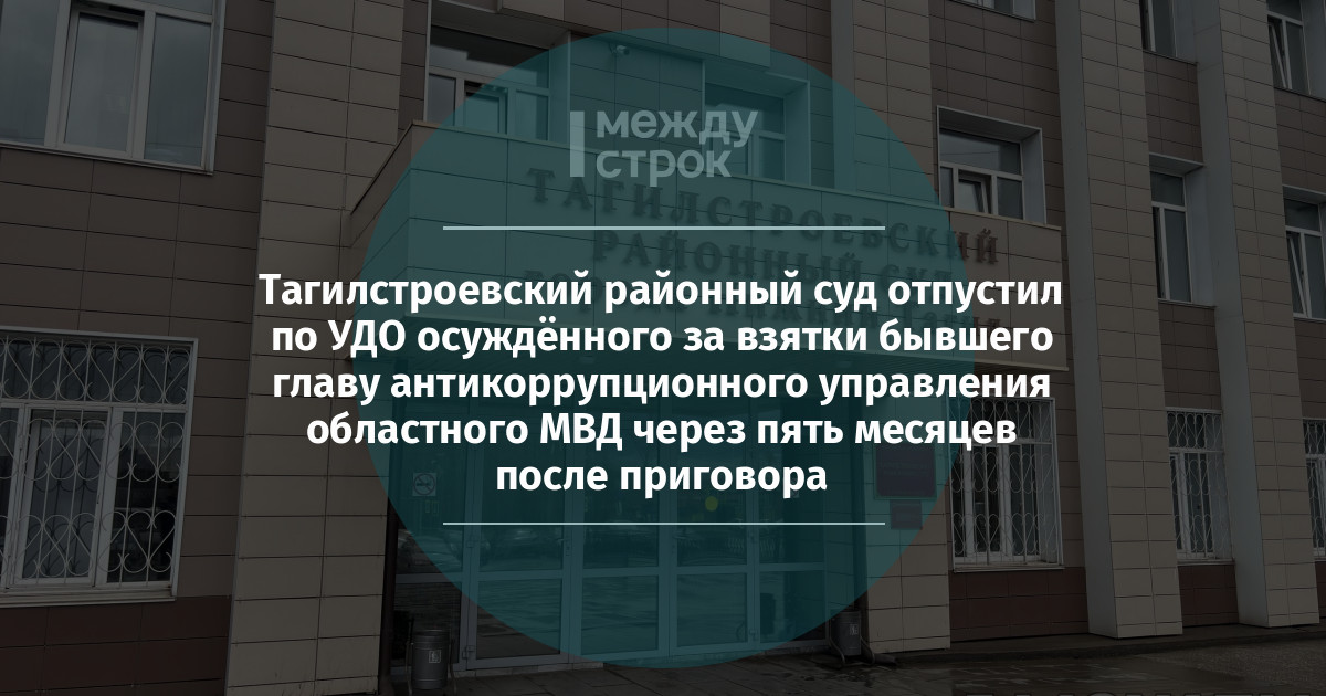 Тагилстроевский районный суд удовлетворил ходатайство об условно-досрочном освобождении (УДО) бывшего начальника управления экономической безопасности и противодействия коррупции ГУ МВД по Свердловской области Андрея Дьякова, приговорённого ранее к четырём годам колонии, сообщили в пресс-службе судов Свердловской области. Всего в заключении Дьяков провёл чуть более пяти месяцев.
