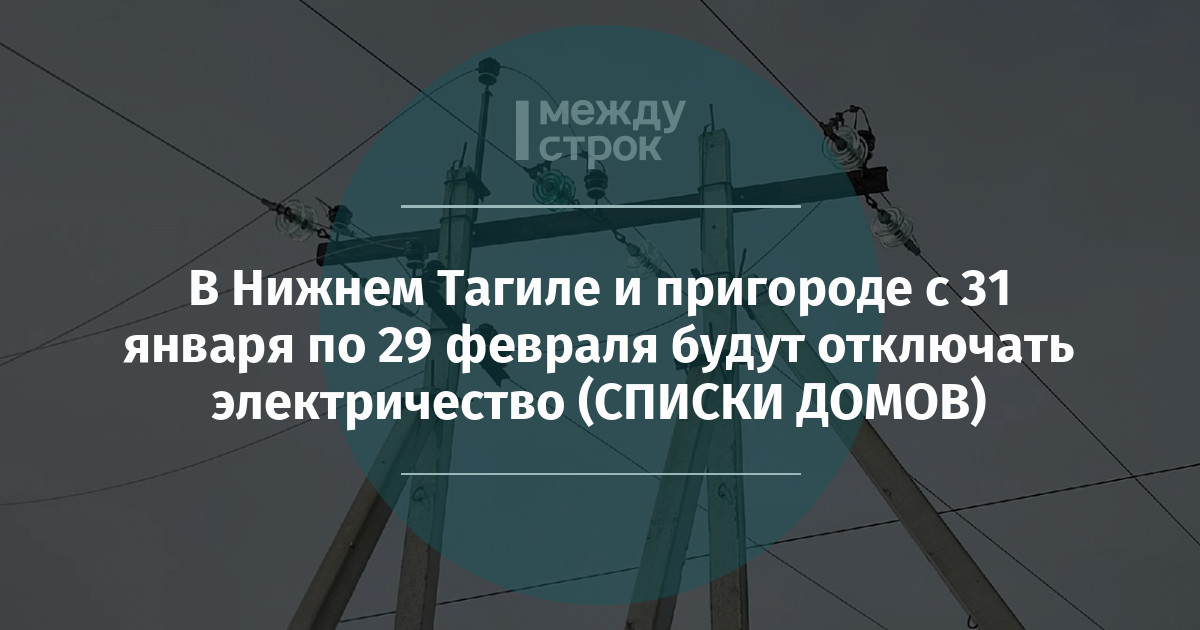 В Нижнем Тагиле с 31 января по 29 февраля АО «Облкоммунэнерго» филиал «Тагилэнергосети» будет проводить плановое отключение электроэнергии для проведения работ. Ограничения также коснутся посёлков Черноисточинск, Антоновский, Висим, Висимо-Уткинск и села Покровское. Свой адрес, число и время отключения можно посмотреть в таблице на сайте администрации города https://ntagil.org/news/aktualno.php?ELEMENT_ID=266031.