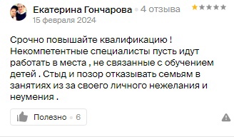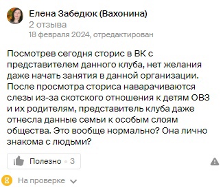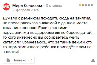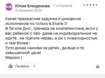 «Были на одной тренировке. Красивая реклама с лозунгами, что берём всех и обучим каждого. Но это всего лишь реклама, для Нижнего Тагила она не соответствует действительности. Если ребёнок с ОВЗ, то ему откажут в посещении сразу или завуалированно, обещая написать/позвонить завтра или в следующем месяце, когда уточнят наличие свободного времени у наставников, которое есть, но не для данного ребёнка. При этом совсем не имеет значения ни уровень нарушений ребёнка, ни то, что об ОВЗ в школе были предупреждены заранее и на пробное занятие записали без проблем. Мой ребёнок хорошо позанимался и ждал следующей тренировки. Дальше просто идите мимо, мы не будем с ним и со всеми детьми, которые имеют хоть какие-нибудь особенности здоровья, работать. P.S.: в Екатеринбурге с этим прекрасно, а тагильский филиал пробил дно снизу. Информации о том, что дети с ОВЗ не допускаются на занятия, нет нигде: ни на официальном сайте клуба, ни на страницах в соцсетях, ни в самом помещении филиала. Информация должна быть в свободном доступе, чтобы каждый родитель имел возможность ознакомиться с ней и не тратил своё время на посещение данного места», — пишет на сайте 2ГИС Наталья Мартынова.
