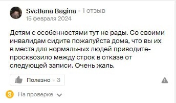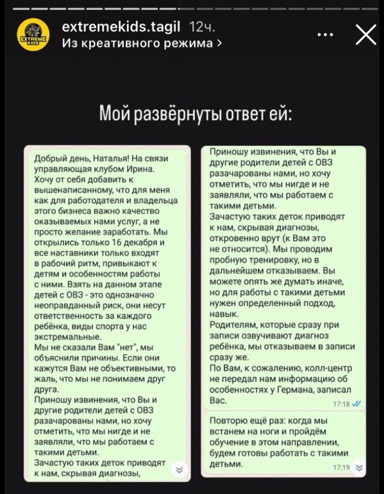 «Очень печально, что не все дети могут посещать данное место. Я мама особенного ребёнка, физически мой ребёнок подготовлен, почему ему отказывают в занятиях из-за того, что он не говорит? И делают акцент на то, что у них экстремальный вид спорта. Ребёнка мы не оставляем одного, он под наблюдением родителей и тренера. У любого ребёнка может пойти что-то не так. Просто больно осознавать то, что с любым ребёнком может случиться беда. И родители не сдаются и борются за то, чтобы ребёнок был как все и адаптировался к жизни. После хорошей тренировки мы были счастливы, что нам не отказали и поддержали, но мы были в числе первых, поэтому было всё хорошо. Видимо, после большого потока таких “неудобных” детей стали отсеивать. Спасибо за ещё одно доказательство того, что если обижают инвалида, то его все жалеют, но если он появляется в обществе, от него хотят избавиться поскорей, чтобы не мозолил глаза», — пишет ещё одна мама ребёнка с особенностями Анастасия Новикова.