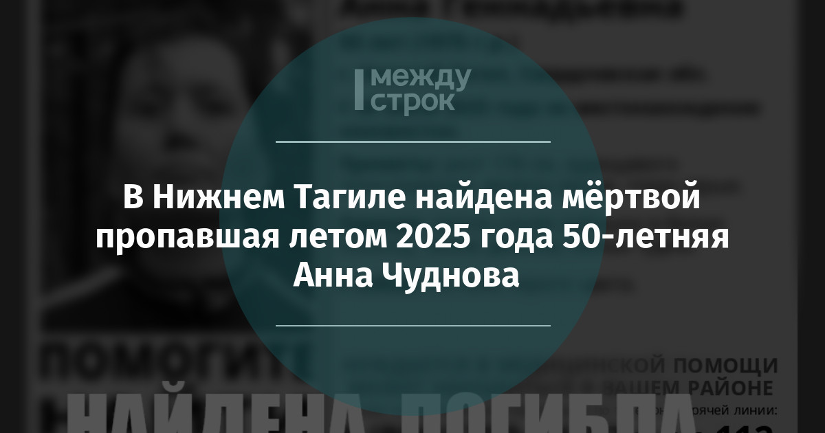 Пропавшая 20 июля 2025 года в Нижнем Тагиле 50-летняя Анна Чуднова найдена мёртвой. Как сообщает «Инцидент Нижний Тагил», тело тагильчанки обнаружил сторож в промышленной зоне. Из-за значительных изменений опознание проводилось по вещам, которые совпали с ранее распространенной ориентировкой.
