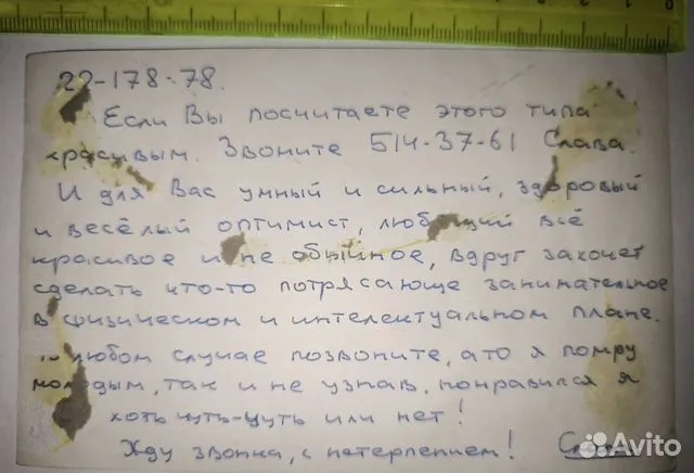 На обороте запечатлённый на фото человек по имени Слава сообщает, что если кто-то сочтёт его привлекательным, то может позвонить ему по указанному номеру. Он назвал себя умным, сильным, здоровым и весёлым оптимистом, который любит всё красивое и необычное и готов сделать что-то «потрясающе занимательное в физическом и интеллектуальном плане».