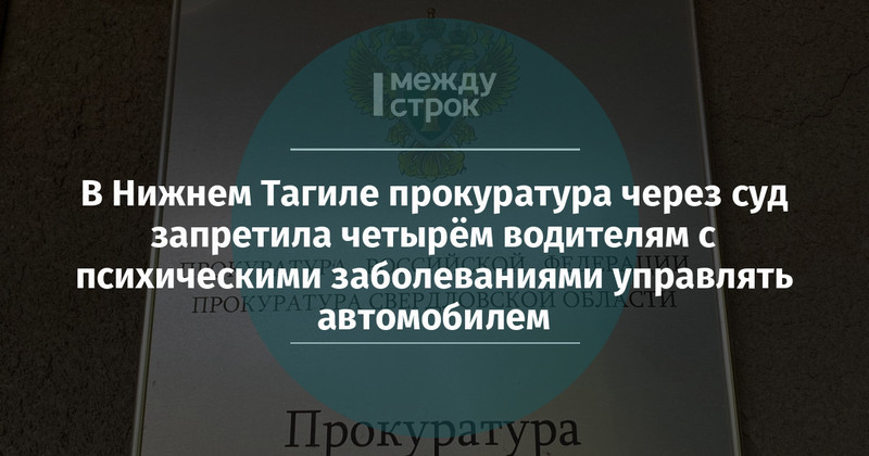 Прокуратура Тагилстроевского района Нижнего Тагила через суд запретила четырём водителям, страдающим психическими заболеваниями, управлять автомобилем, сообщили АН «Между строк» в пресс-службе прокуратуры Свердловской области. О том, что по дорогам города ездят люди с серьёзными диагнозами, такими как наркомания и шизофрения, стало известно в ходе плановых проверок, направленных на соблюдение безопасности дорожного движения.