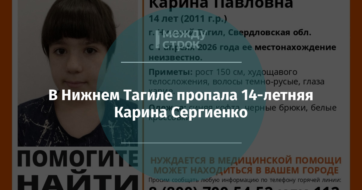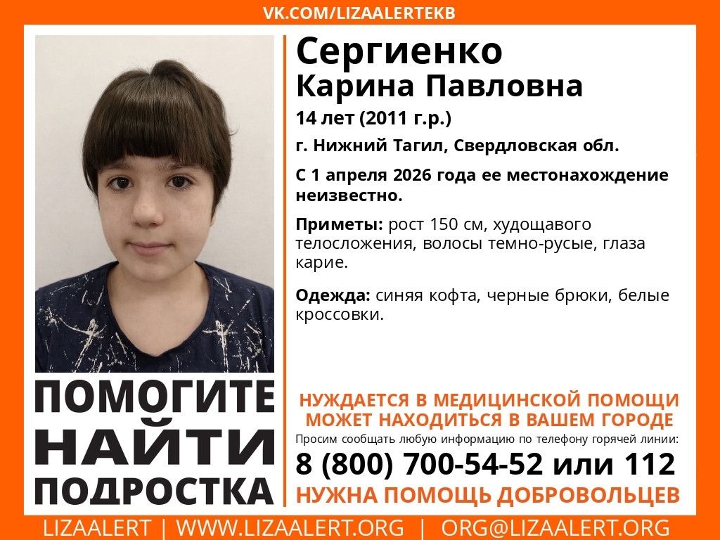 В Нижнем Тагиле разыскивается 14-летняя Карина Сергиенко. 1 апреля девочка ушла из дома в районе Ледового дворца спорта на Вагонке. С этого момента её местонахождение неизвестно. Нуждается в медицинской помощи.