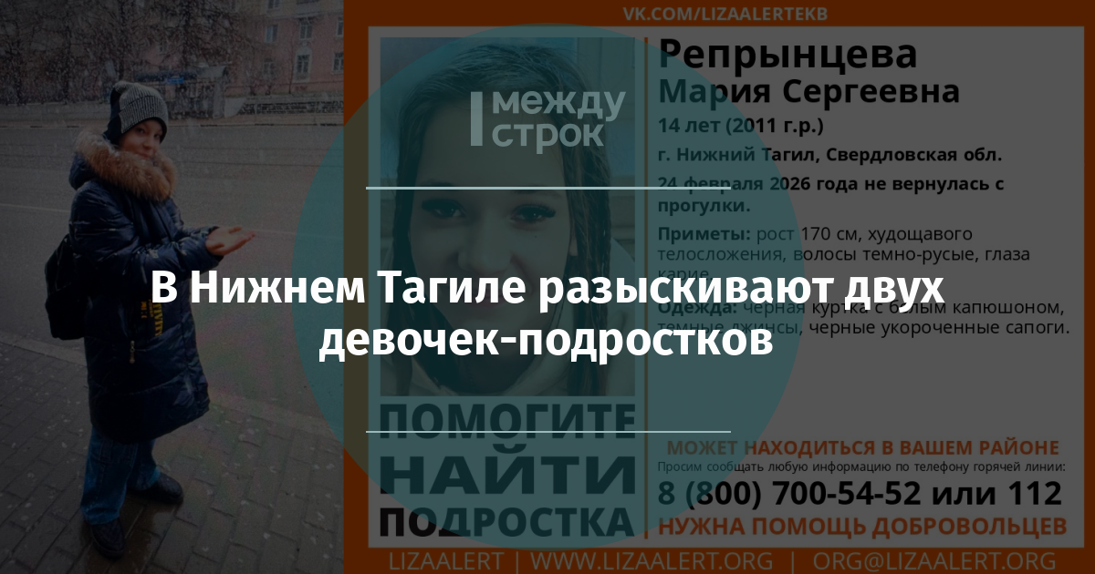 Также, в Нижнем Тагиле разыскивают 14-летнюю Марию Репрынцеву, которая ушла на прогулку и не вернулась.
