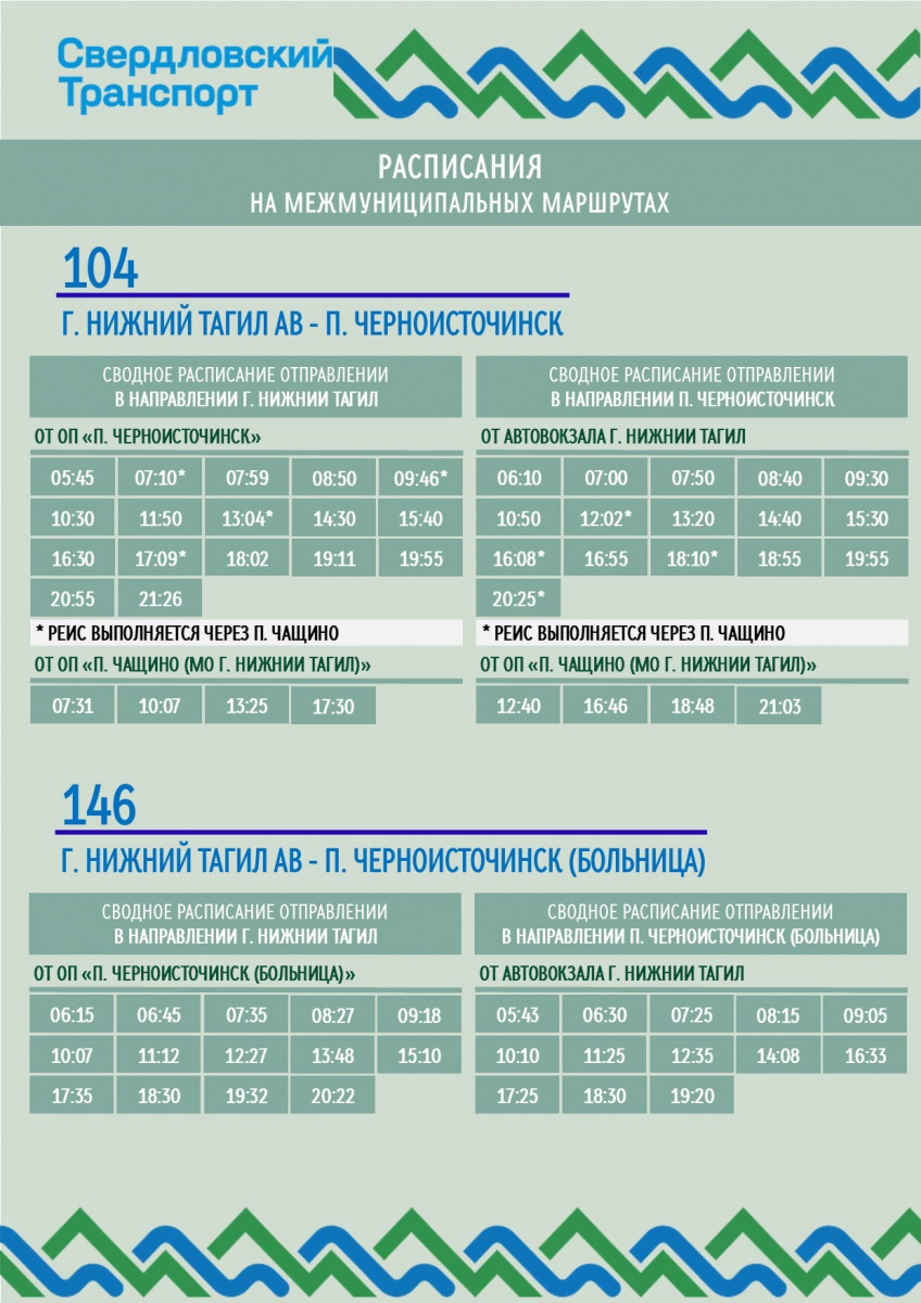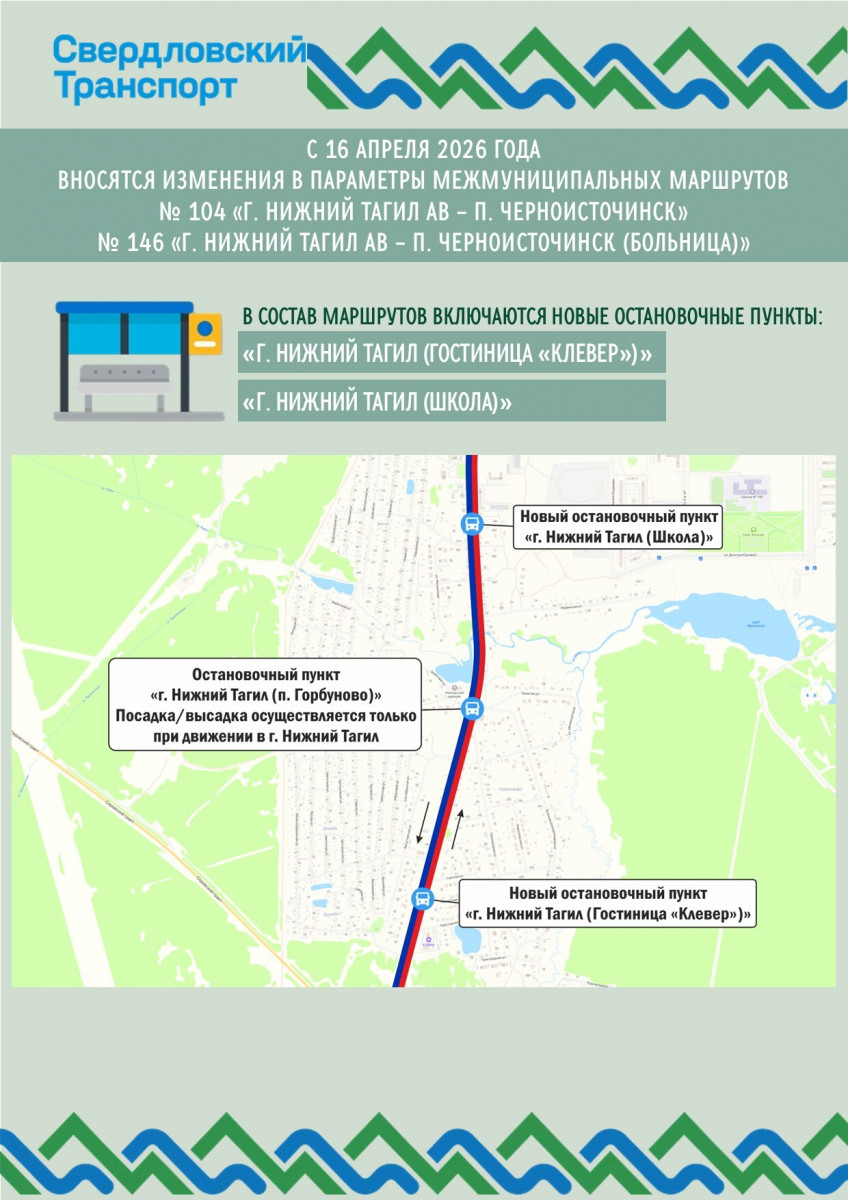 С 16 апреля изменится движение автобусных маршрутов № 104 и № 146, связывающих Нижний Тагил с посёлком Черноисточинск. В маршруты добавят новые остановки — «Гостиница Клевер» на улице Горбуновской и «Школа» на улице Просёлочной. Также будет скорректировано расписание автобусов, сообщается на портале «Свердловский транспорт»