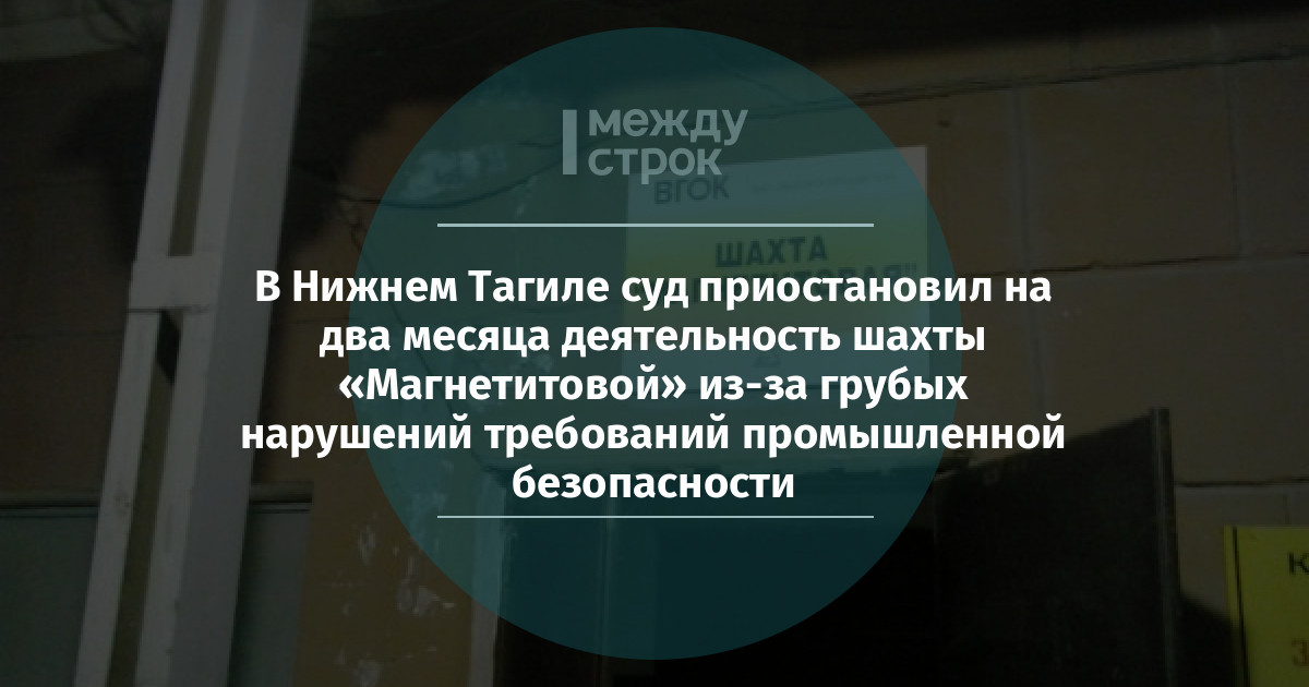 Сегодня Ленинский районный суд Нижнего Тагила вынес постановление о приостановке деятельности шахты «Магнетитовой» «Высокогорского горно-обогатительного комбината» (ВГОК) в связи с грубыми нарушениями требований промышленной безопасности.