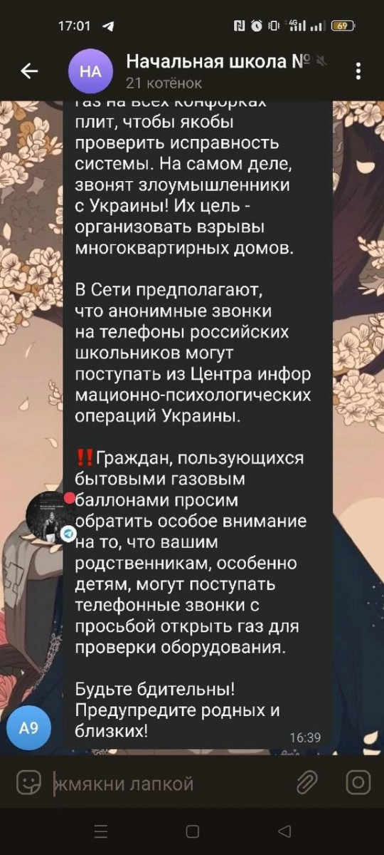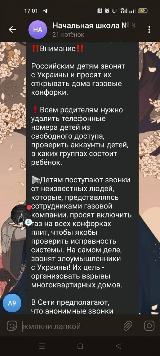 В родительских чатах Нижнего Тагила учителя общеобразовательных учреждений стали рассылать сообщения, что некие диверсанты из Украины звонят детям и, представившись сотрудниками газовых служб, вынуждают школьников включать дома газовую плиту. Аналогичная информация опубликована в официальной группе во «ВКонтакте» администрации Дзержинского района Нижнего Тагила. Чиновники напоминают о необходимости быть бдительными и рекомендуют родителям заблокировать доступ всех неизвестных номеров на телефон ребёнка, оставив только контакты близких и родственников.