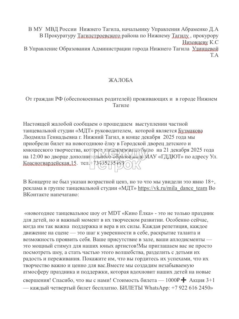 В Нижнем Тагиле возмущённые родители детей, посетивших новогоднее шоу «Кино ёлка» (18+) танцевальной студии MDT, которое прошло в Городском дворце детского и юношеского творчества (ГДДЮТ) и вызвало широкий общественный резонанс, направили жалобу (есть в распоряжении редакции) в прокуратуру, полицию и мэрию с просьбой провести проверку деятельности обеих организаций.