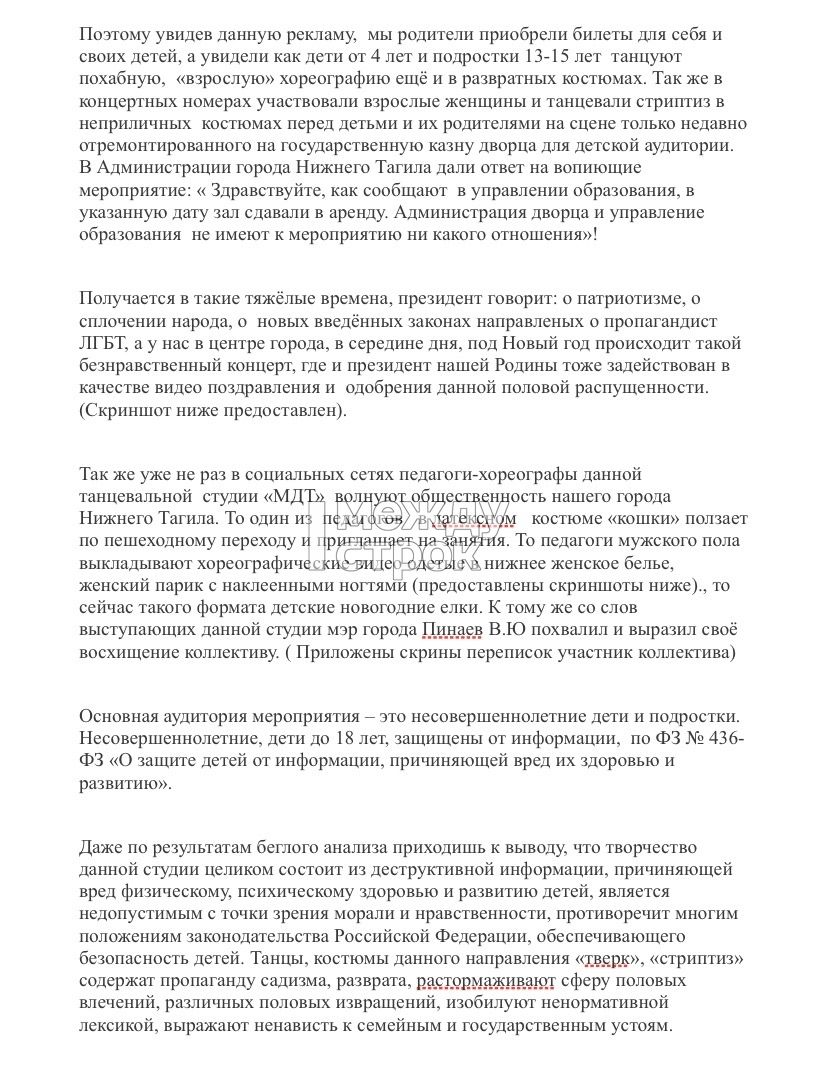 В Нижнем Тагиле возмущённые родители попросили прокуратуру проверить городской дворец детского творчества и танцевальную студию MDT после новогоднего секс-скандала из-за выступления артистов «в похабных, развратных костюмах»