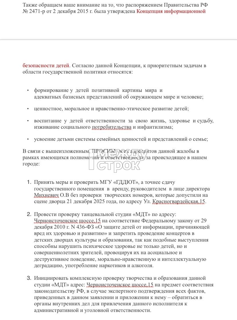 В частности, родители просят «принять меры и проверить МАУ ДО “ГДДЮТ”, а точнее сдачу государственного помещения в аренду в лице руководителя Михневич О. В. без проверки творческих номеров, которые допустили на сцене дворца 21 декабря 2025 года по адресу, ул. Красногвардейская, 15».