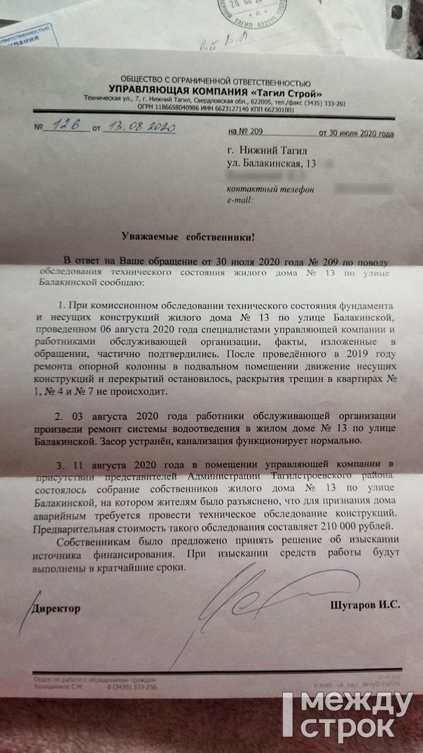 В 2020 году со своей бедой жильцы обратились в прокуратуру Тагилстроевского района. Надзорное ведомство с привлечением Министерства энергетики и жилищного-коммунального хозяйства Свердловской области обязало УК «Тагил Строй» выполнить работы по выявлению причин появления трещин и их устранению, а также установить маяки и устранить проблемы с канализацией.