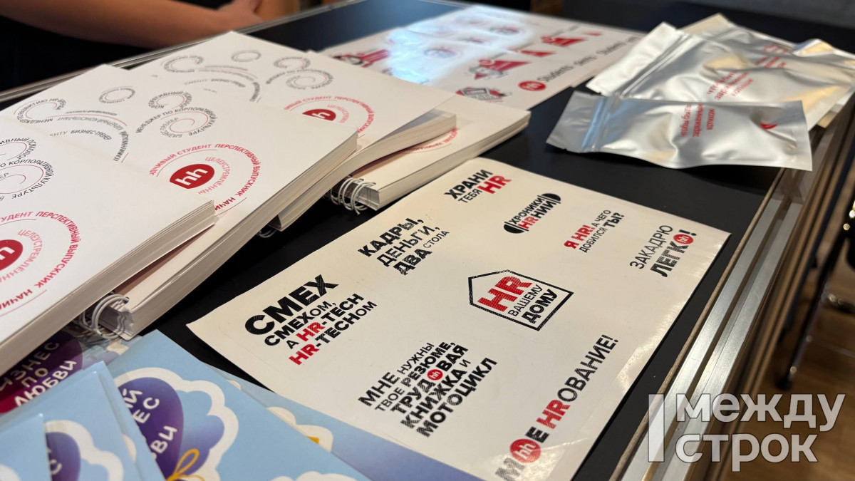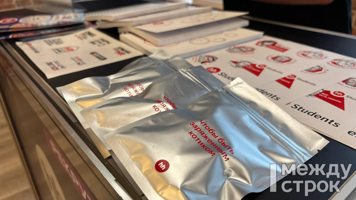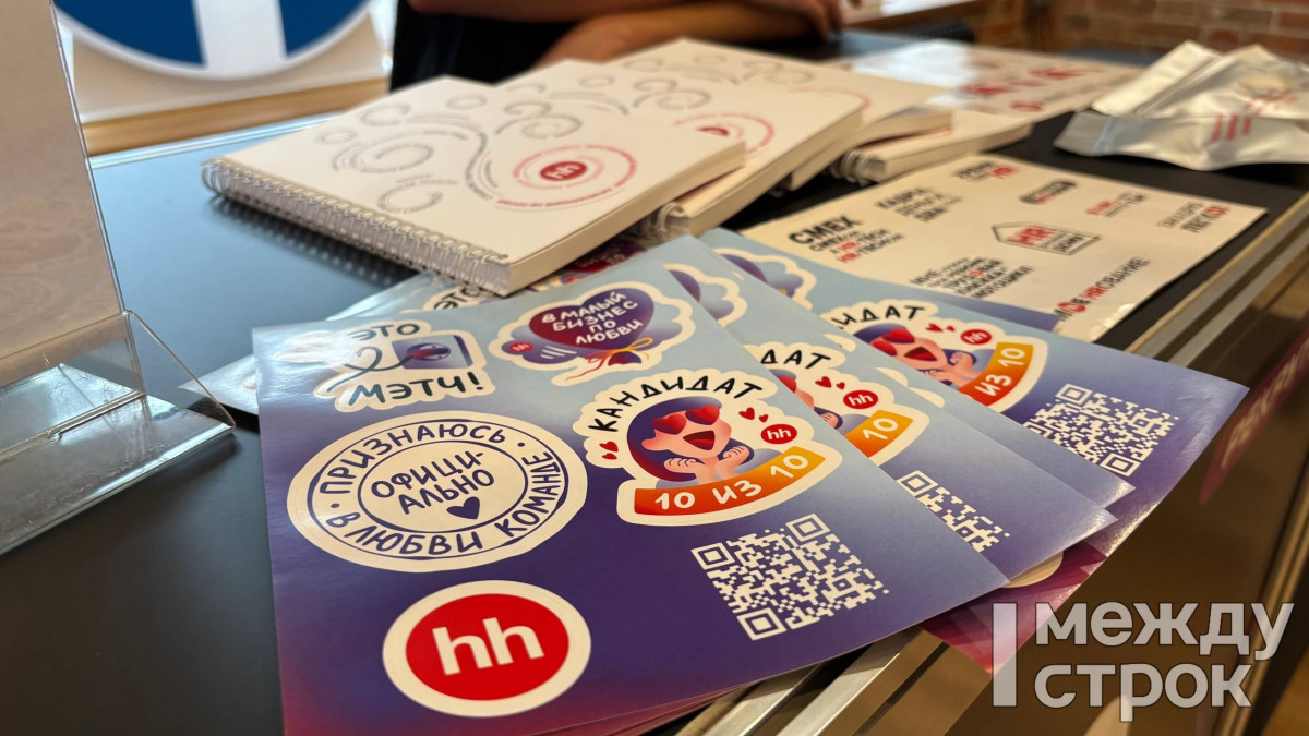 У стенда сервиса hh.ru можно пройти опрос из трёх вопросов и получить подарок: блокнот, стикерпак или светящийся браслет.