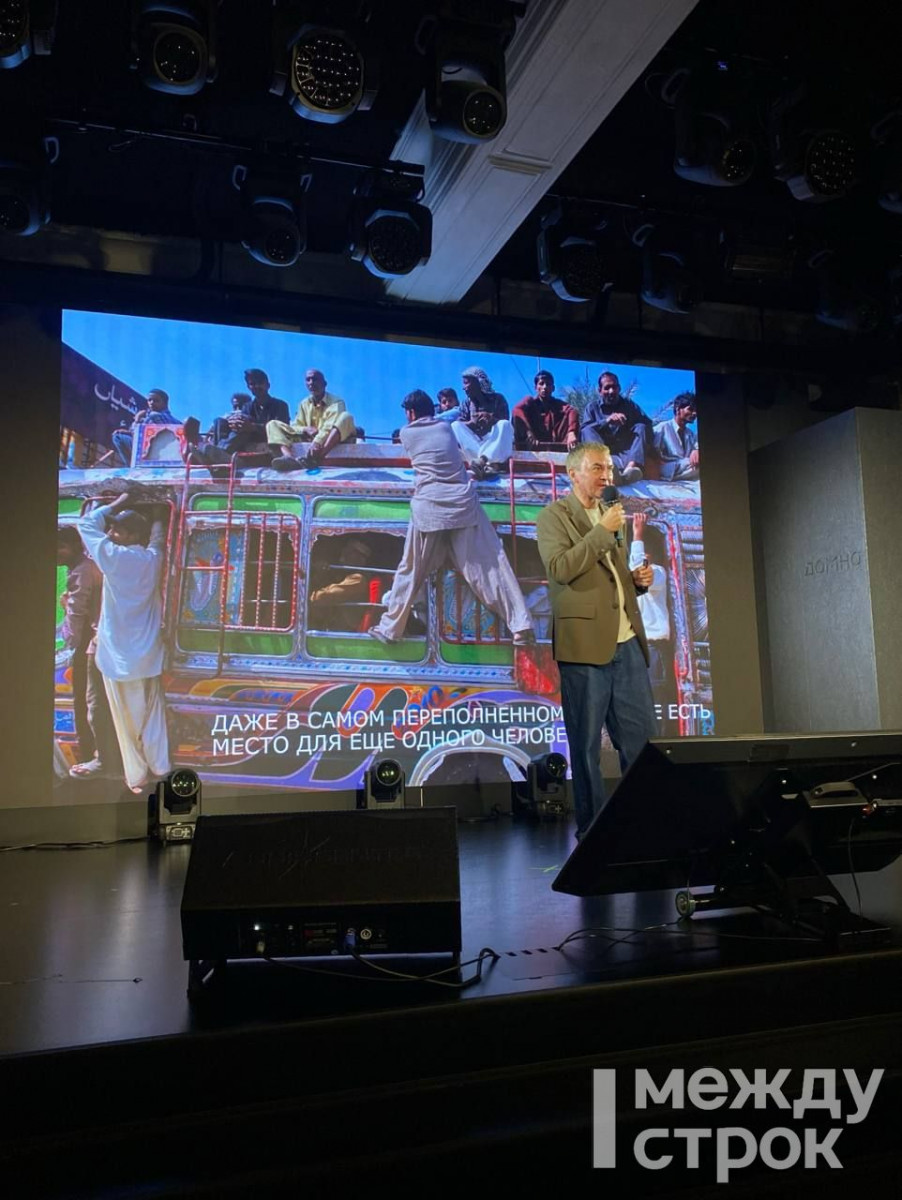 Следующий спикер в зале с колоннами — Леонид Корысткин. «Успех и стеснение — это не связанные между собой вещи».